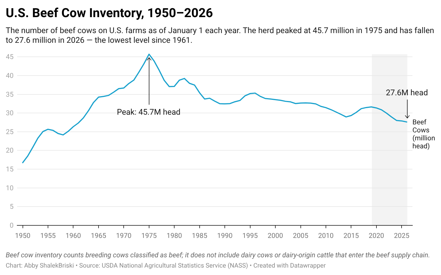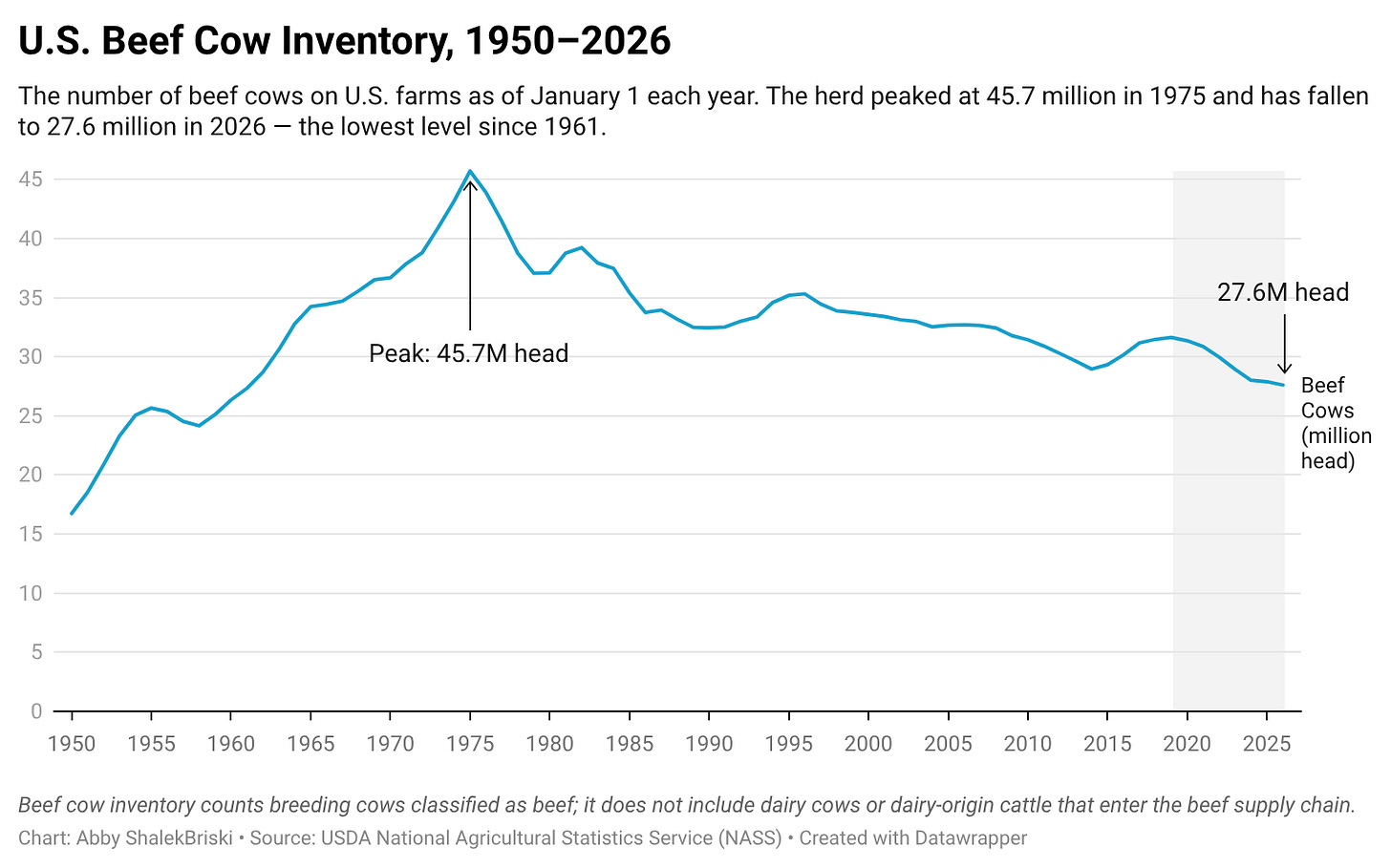 The U.S. beef herd, at approximately 27.6 million head of cows, is at its lowest level since the 1960s. The 2010s brought drought, low prices, and herd liquidation. While cattle prices have steadily increased since 2017, herd rebuilding remains slow, and beef prices remain high.