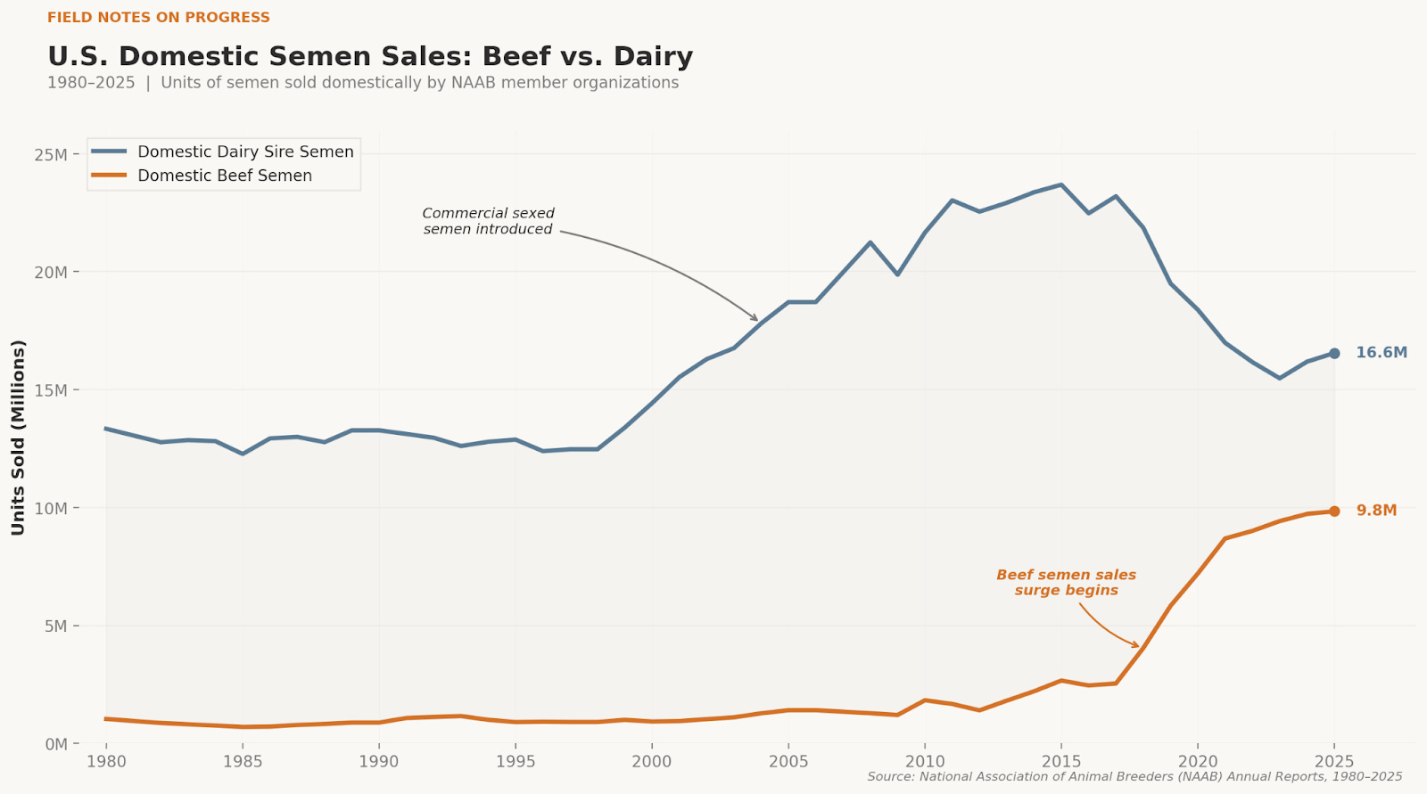 This shift cannot be overstated. Between 2013 and 2024, beef semen sales in the United States increased 437%. Starting around 2017, the sale of purebred Holstein semen dropped.