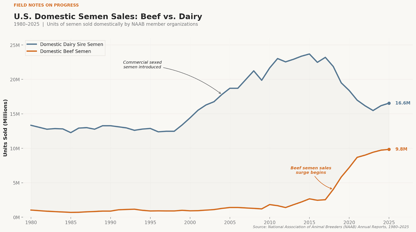 This is, on one level, a story about semen. On another level, it is a story about industrial organization. A technology that helped dairies solve one problem, replacement heifers, also gave them a new way into the beef business. The important question is not simply whether this adds much more beef in aggregate. It is whether reproductive technology has changed who gets to compete for value inside the cattle industry.