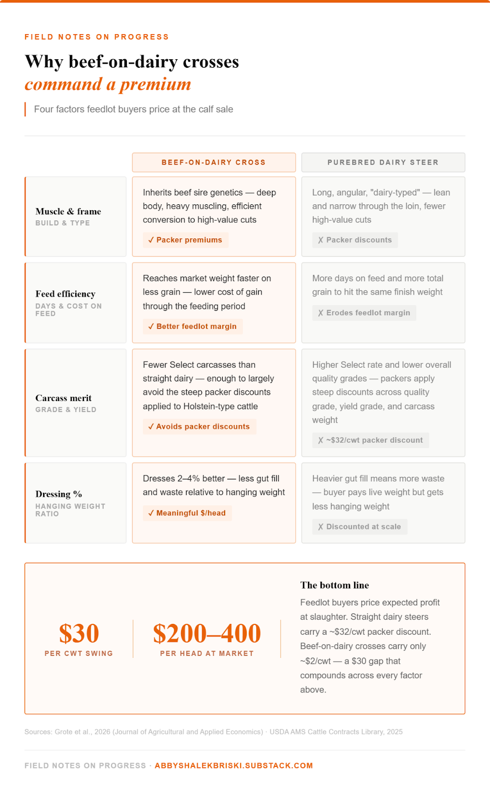 Accompanying this abundance was a realization: any breeding slot not needing to produce a replacement heifer could be used for something else. Herd managers started using beef semen. For example, a manager crossing a Holstein cow with an Angus bull gets a bull calf that splits the difference between the two breeds. The calf yields more muscling than a purebred dairy steer, might qualify for Certified Angus Beef premiums, and has better feed efficiency. Beef packers have discount straight-bred dairy steers, around $32 per cwt, because their carcasses are leaner, narrower, and yield less of the high-value cuts that come from a thick-loined beef animal. But beef-on-dairy crosses? Only about $2 per cwt. In a recent Oklahoma State feeding trial, beef-on-dairy crosses in calf-fed systems actually returned more per head than native beef calves raised in the same system2. These results will vary by region and genetics. Regardless, these preliminary results indicate the ability of beef-on-dairy crosses to compete economically with beef systems.