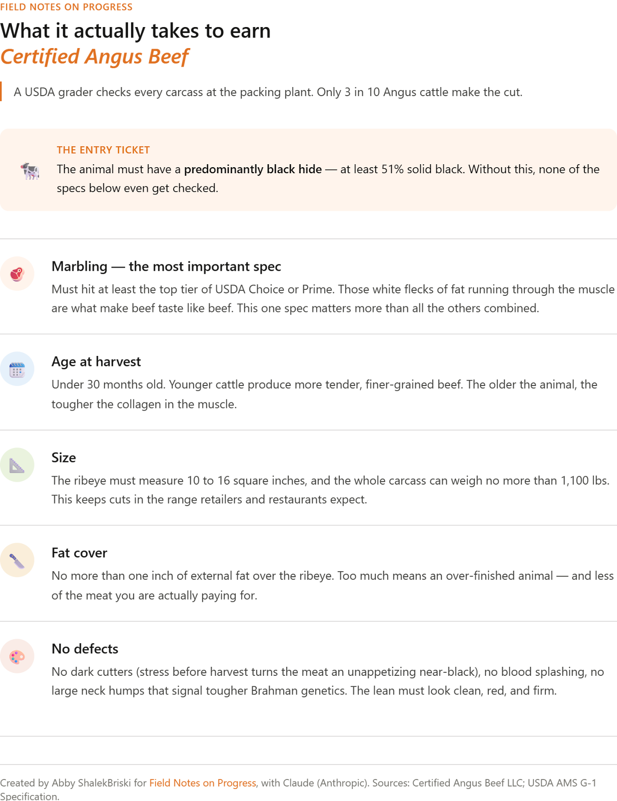 What most consumers think about is the steak in front of them. What the beef industry thinks about is breed, certification, and shelf placement. Certified Angus Beef (CAB) is the most widely recognized beef certification in the country. Its most famous requirement is that the animal must have a predominantly solid black hide. The real disqualifier is looking like a dairy cow: light muscling, wrong conformation. CAB keeps straight Holsteins out.