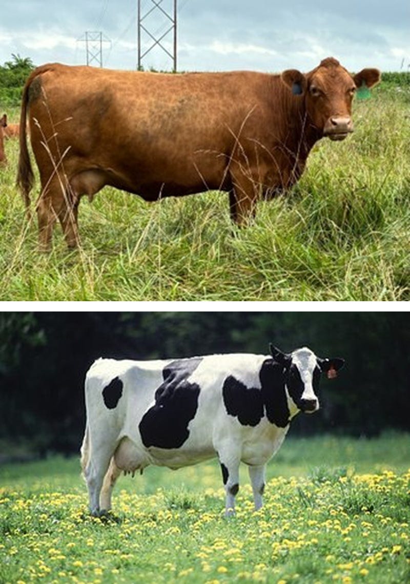 This bifurcation goes so deep that dairy and beef cows are essentially different animals. The average beef cow may produce 10-20 lbs of milk a day, while a modern Holstein dairy cow may produce 60-100+ lbs. Holsteins are bred to efficiently convert feed into milk, while a beef cow is more compact, heavily muscled, and bred to convert feed into muscle. They are optimized for entirely different means.